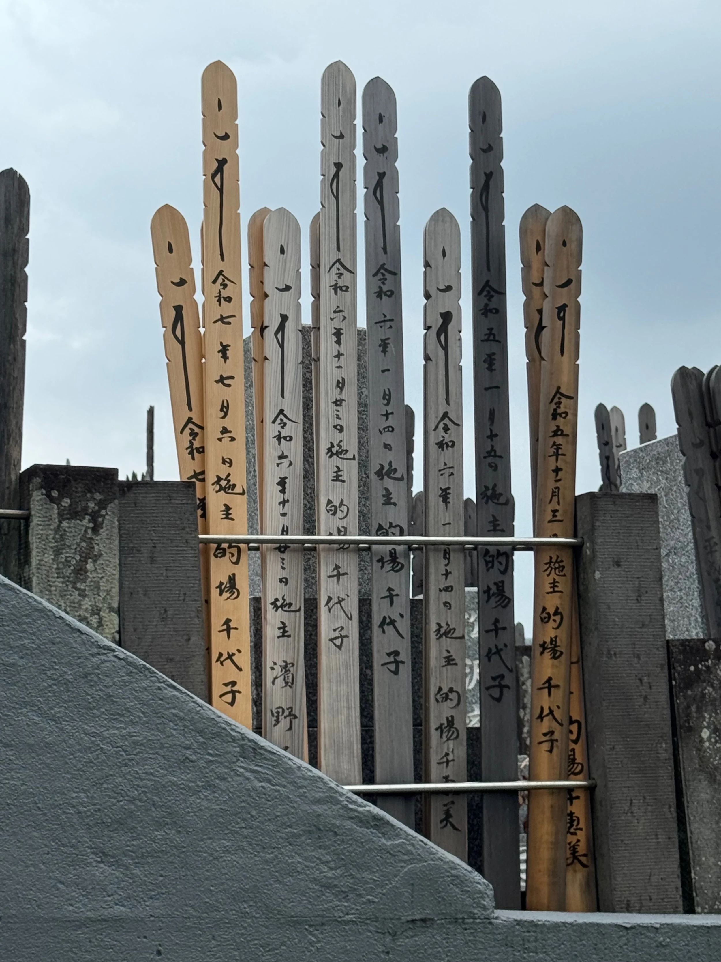 Underway we passed a Buddhist cemetery and I photographed the interesting ski-like objects called Sotōba - these contain information about the deceased, in stylized Sanskrit strokes and Kanji. We also were surprised to discover a real pomegranate tree in the wild!